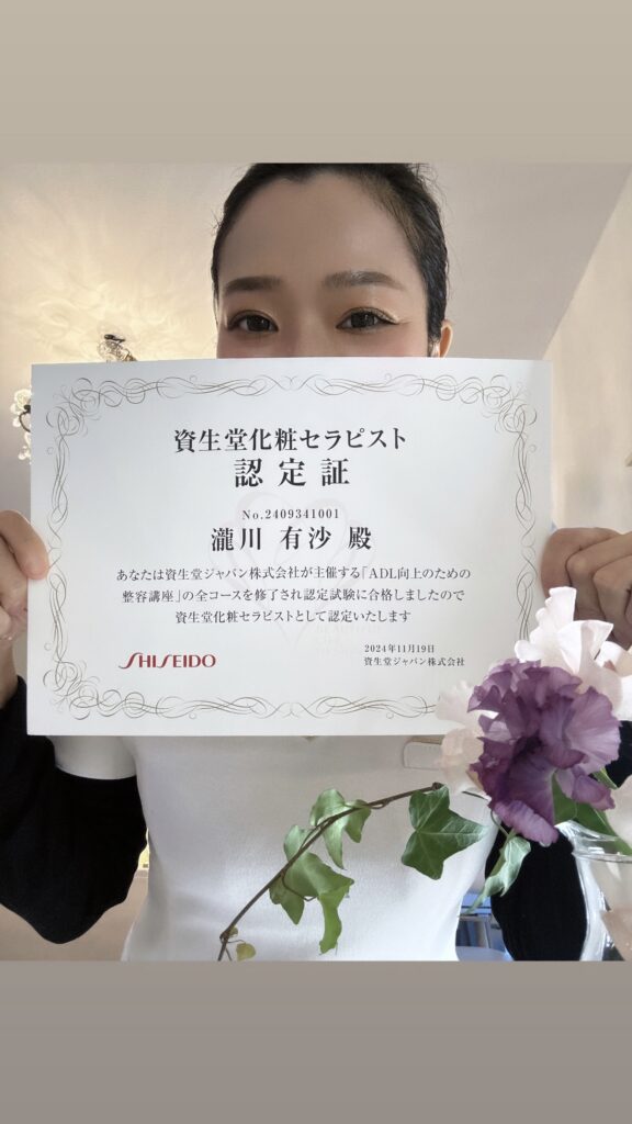 この度資生堂さんのADL向上のための整容講座BASICコース、MASTERコースを修了し無事資生堂化粧セラピスト資格の認定を頂きました💄✨座学での学びを深めた後は同じ試験